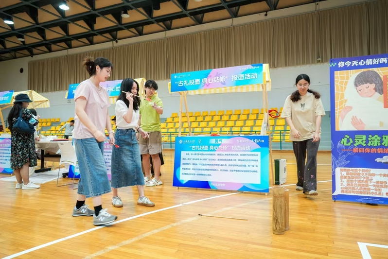 心理学院“谢谢便利贴”,学生们通过书写感谢便签分享温暖瞬间,体验感恩对人际关系和幸福感的提升作用;在涂鸦创作中学生们通过涂鸦、音乐、肢体动作等体验情绪支持的力量。教育学院“神奇的OH卡:探索内心世界”,在专业引导下展开对自我内心的奇妙探索。哲学与法政学院的“哲里心花怒放”用五彩扭扭棒编织花朵手环,指尖翻飞间,巧手生花,心意传递,让美好寓意在腕间流转。环境与地理科学学院的“星球心绘”涂绘坊前,不同色调的丙烯颜料在手中流转,将内心情绪转化为独一无二的“情绪星球”,碎片化的情绪在创作中获得整合。美术学院“染绘绮梦”扎染体验,让每一块蓝白相间的作品都绽放出传统工艺的现代活力。化学与材料学院的彩虹许愿瓶,通过揉捏、挤压水宝宝释放压力,成为对抗焦虑的“触感良药”。生命科学学院的香囊制作区化身为传统草本工坊,一囊一世界,草木寄幽思,一场沉浸式的五感疗愈体验将压力缓缓释放。对外汉语学院的“投壶”活动,动静相宜,在张弛有度的节奏中体会乐趣。音乐学院的“油菜花”同学们还创作了原创歌曲《心光涟漪》,谱成琴键上“我爱我”的动人旋律。还有“快乐小狗制作机”活动区、“墨香凝情,笔韵传心”书法体验区、“心理科普现场”展区前都人头攒动,学生们在欢声笑语中体验快乐情绪、聆听内心声音、学会关爱自己。
