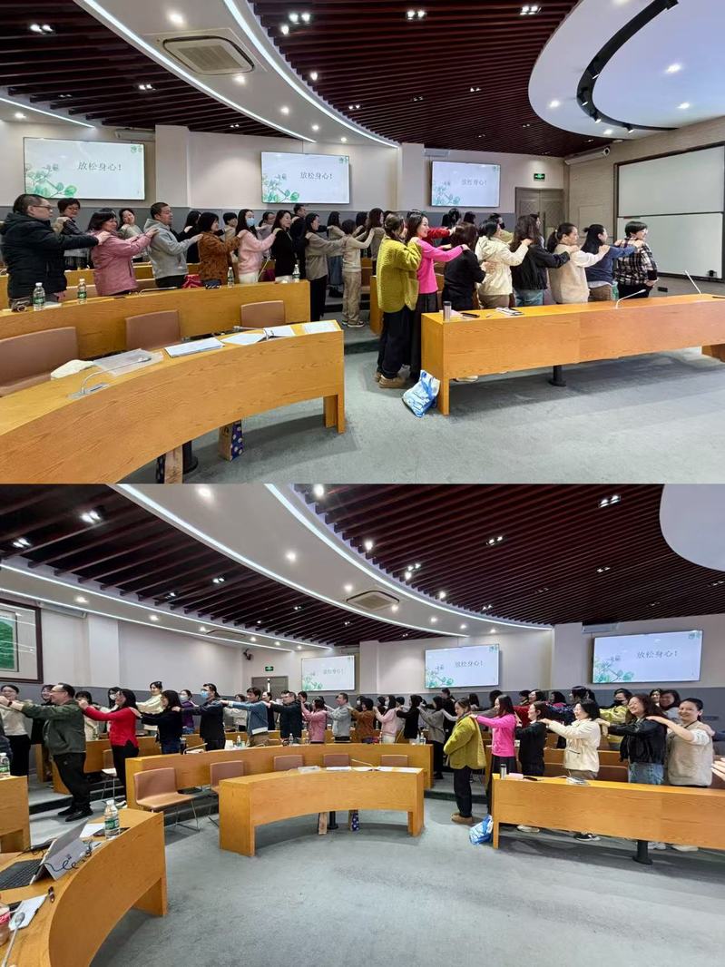 讲座伊始,吴燕霞带领全体与会老师进行了一个有趣的压力测试,帮助老师们了解自身当前的身心状态。然后带领大家进行一段轻松愉悦的轻柔体操活动,帮助大家缓解压力,放松身心,营造了开放、包容的交流氛围,为后续讲座奠定了良好基础。